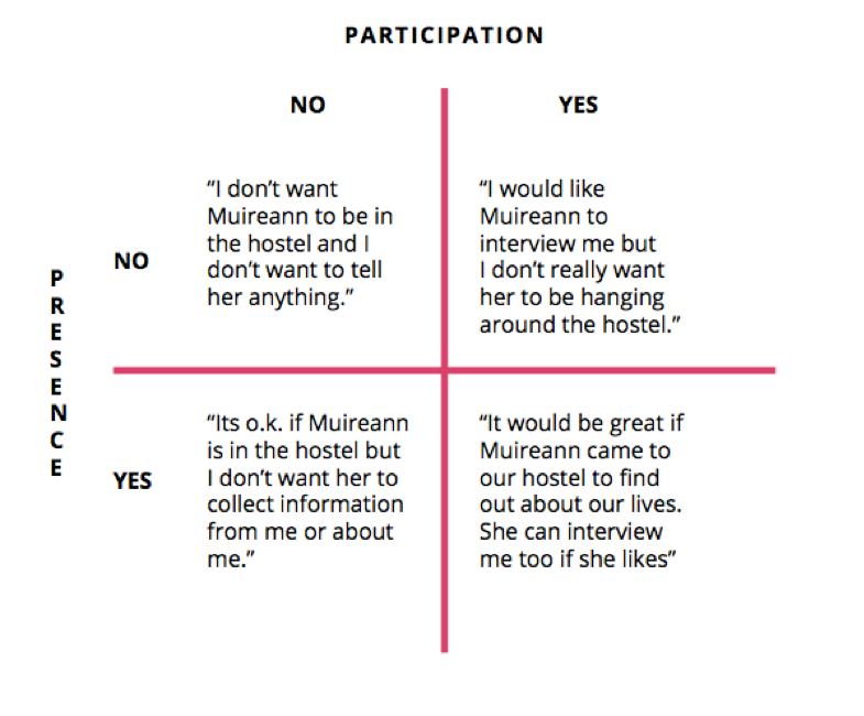 It was decided that if a significant majority were in favour of the research going ahead it would continue. However, those not wanting to participate needed to be accommodated also. For this reason informed consent from the young people was sought on two separate issues. In order to move forward in a way that sought to balance the rights of both potential groups, the ‘consenters’ and ‘non-consenters’, the researchers framed the process in two parts: The first related to the researcher’s presence in the hostel, whilst the second related to the actual participation of the young people in the research process. We recognised that whilst a young person might not mind the researcher (Muireann) being in the hostel, he or she might not want her to be gathering information in relation to him or her. Therefore, consent to the first did not imply consent to the second. Arising from this differentiation, Figure 1 (Ní Raghallaigh, 2006) illustrates the potential combination of responses that the young people could give when the researcher sought their consent.