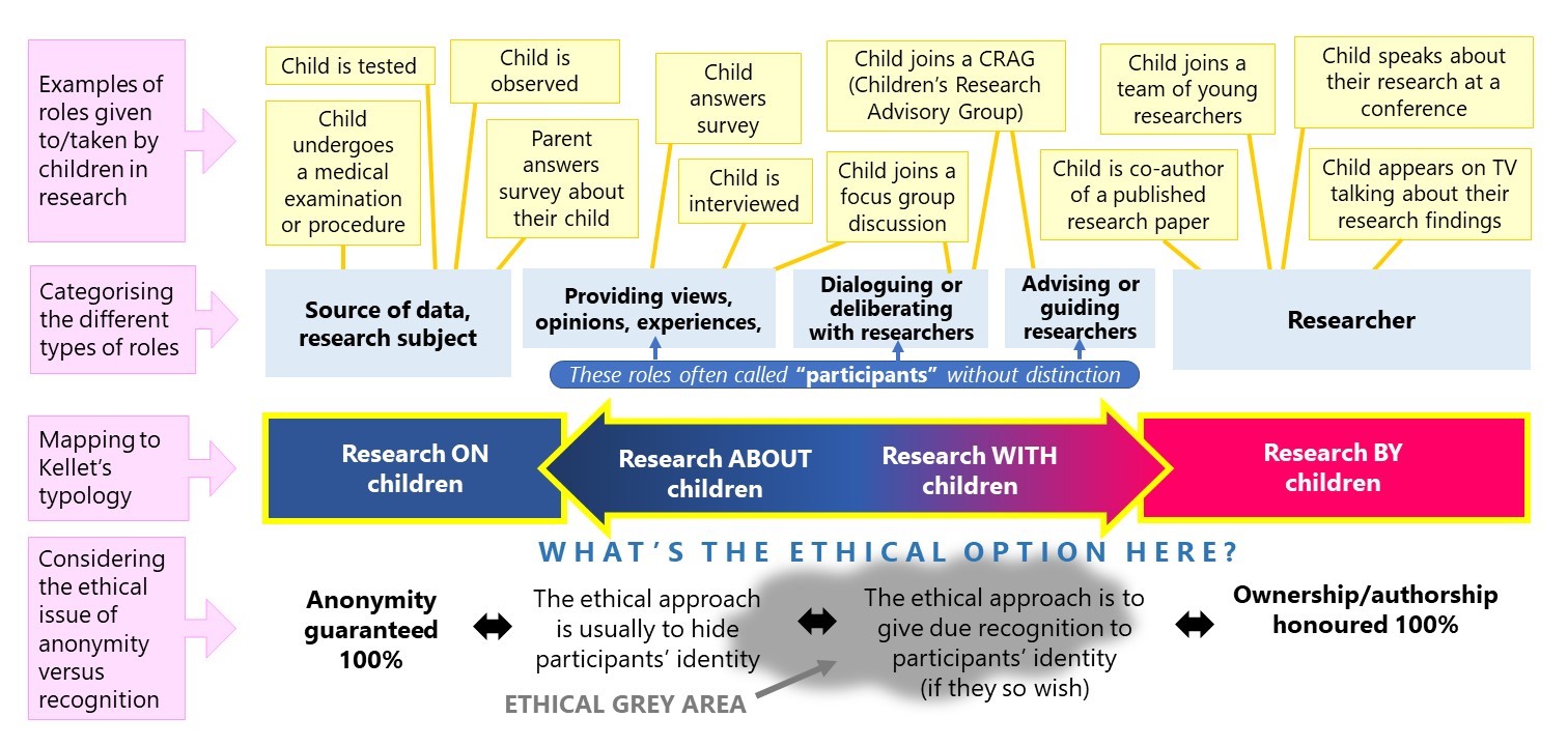 - In writing up research it is common these days to refer to the children involved as “participants”. This is a positive step insofar as it tells us they are seen as more than just data sources. However, as indicated in the centre of the diagram, the term “participants” can cover a number of distinct roles, and this can be unhelpful. We need to unpack and understand each role properly if we are to make wise ethical decisions about how to support, protect, and at the same time recognise the children involved.
