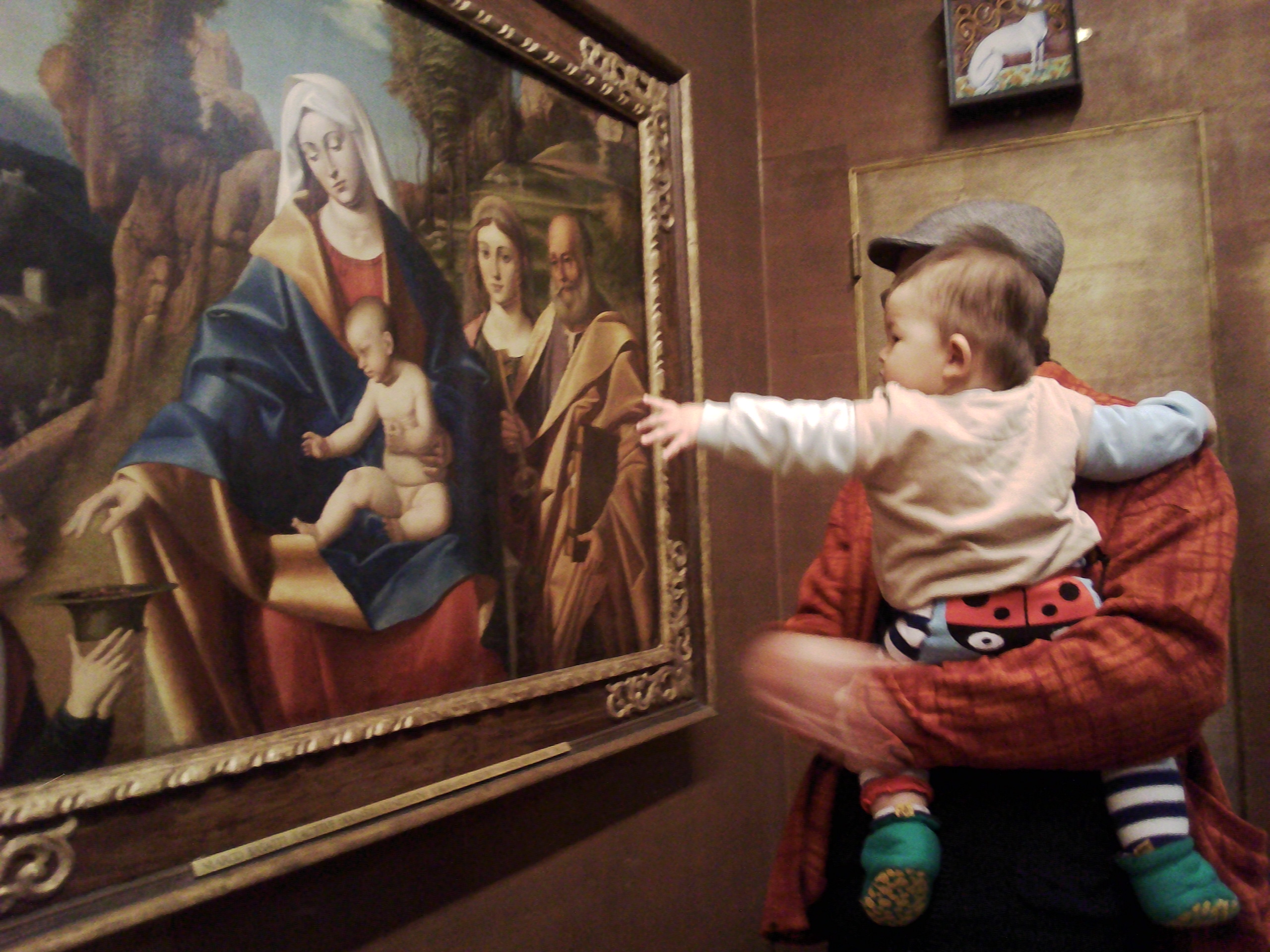 In addition to photographs taken by families, the museum staff also captured (with consent of parents) images of children and families in the galleries. These served as key stimuli for ongoing reflections and shaped our understanding of how children were using their bodies and facial expressions in the galleries. For babies and young children, eye gaze and positioning of the head (particularly when being carried in a sling) are important modes of communication that are both relational and show independence. In documenting these we hoped to honour the decision making and physical experiences of the babies’ embodied “voices”.